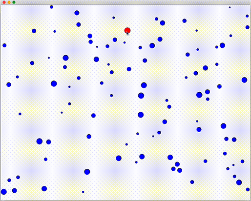 Cet exercice consiste à programmer un environnement target agnostic, c'est à dire dans lequel le curseur connait les propriétés des cibles qui sont affichées. Dans cet environnement, vous devrez développer un Bubble cursor basé sur la distance, c'est à dire que le curseur highlightera la cible dont le bord est la plus proche, comme illustré par l'image ci-dessous. Lorsque l'utilisateur cliquera sur le bouton de la souris, cela selectionnera la cible highlightée à ce moment la.