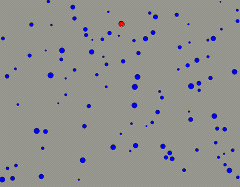 Cet exercice consiste à programmer un environnement target agnostic, c'est à dire dans lequel le curseur connait les propriétés des cibles qui sont affichées. Dans cet environnement, vous devrez développer un Bubble cursor basé sur la distance, c'est à dire que le curseur highlightera la cible dont le bord est la plus proche, comme illustré par l'image ci-dessous. Lorsque l'utilisateur cliquera sur le bouton de la souris, cela selectionnera la cible highlightée à ce moment la.